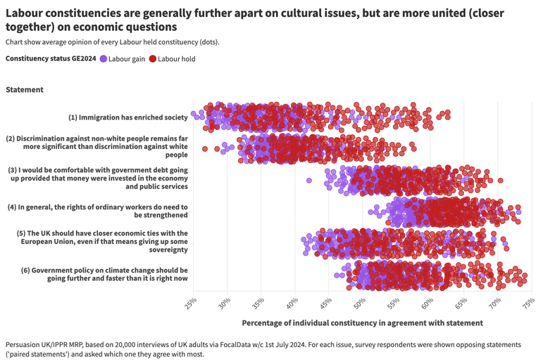 This has already kickstarted a debate about what kinds of policies these voters may (or may not) support and what they expect of a Labour government. To get at this, Persuasion UK and IPPR have undertaken a big new MRP poll – conducted via FocalData in the week of 1st July - to provide an initial answer to this question. This ‘mega poll’ allows us to map opinion on key issues down to constituency level, as well as analysing the opinion of swing voters.