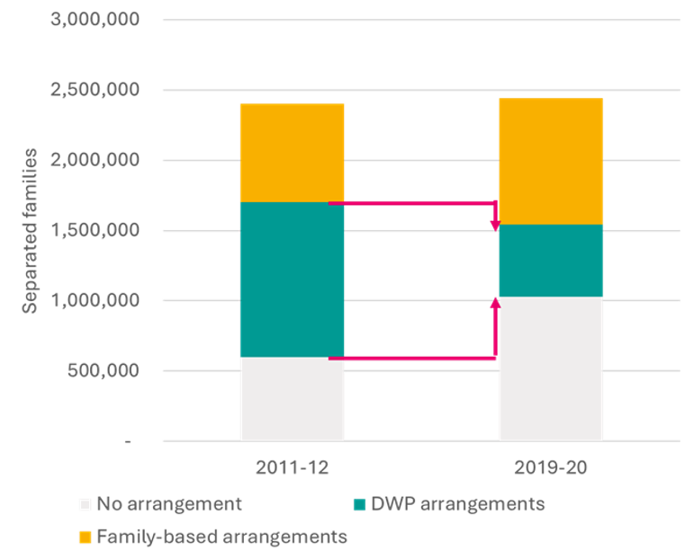 As Figure 1 shows, more than one million separated families went without a maintenance arrangement as of 2020, compared with around 600,000 in 2012 before the reforms took hold. Not only has the attempt to squeeze families out of DWP arrangements (shown in green) clearly worked, but this squeeze has also resulted in far more families ending up with no arrangement (grey) than with family-based arrangements (yellow) as the reforms intended.