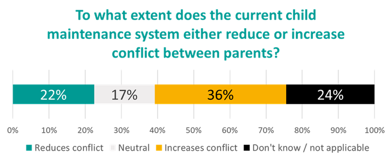 Looking at our polling, among parents in Scotland with experience of the CMS – 35% rate their experience using the CMS as negative (Figure 2); and 36% believed the current maintenance system increases conflict rather than reduces it (Figure 3). As shown in Figure 3, notably more than say it was a positive experience or reduced conflict.