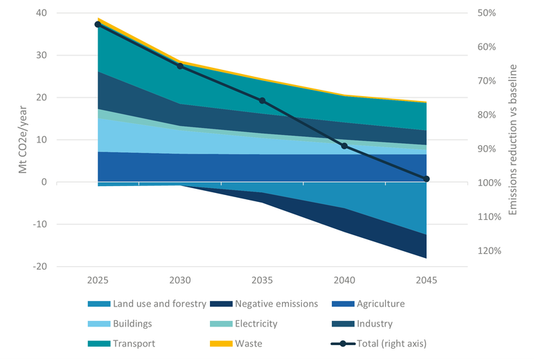 Figure 2: One potential pathway to net zero by 2045 would split effort between decarbonisation and negative emissions