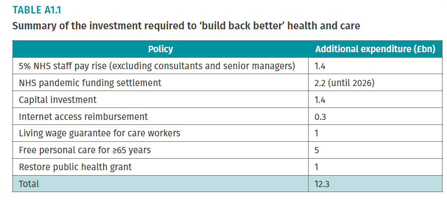 An extra £12 billion a year is needed to invest in the NHS and care system, to recover the damage done by Covid-19 and ensure the health service can guarantee world-leading outcomes and care for generations to come.
