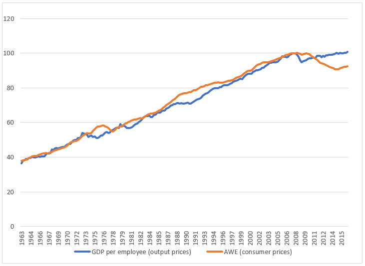 GDP per employee and average weekly earnings, each deflated by output prices and consumer prices