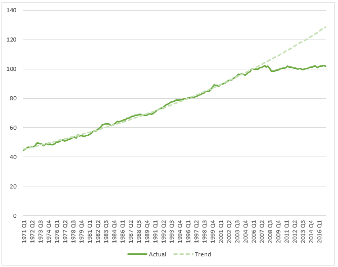 One of the key causes lies in the labour market. With more than 2.5 million people unemployed between 2010 and 2013 and ready to accept low wages to get back into work, record low interest rates were not enough to make investment in machinery, software and training cheaper than simply taking on more low paid workers. In the first three months of 2017, hourly productivity (the value of an average hour’s work) was 21 per cent lower than would have been expected prior to the 2008 crisis.