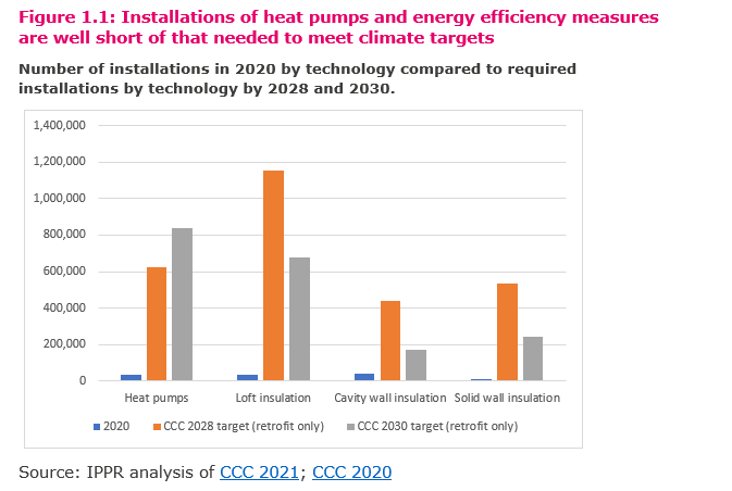 The think tank lays bare the scale of the challenge as it outlines the gap between the number of energy efficiency and heat pump upgrades currently being installed, and the number that will be needed annually by 2028, as set out by the Climate Change Committee (CCC) to reach net zero. IPPR’s analysis shows that the UK is only installing: