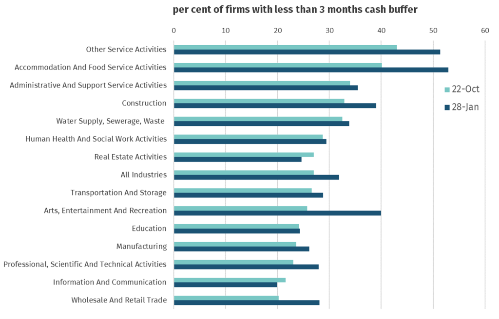 - The number of firms with less than three months’ cash reserves, considered a danger point for a business, rose sharply over the four months to the end of January – from one in four to one in three - despite two new rounds of cash grants for firms compelled to close during lockdown.