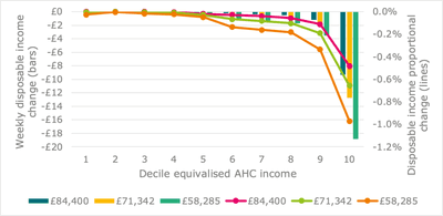 Figure 2: Absolute and proportional change in income across various three new tax band scenarios