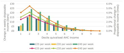 Importantly, this would come over and above the already 40,000 children expected to be lifted out by the existing £25 payment. As would be expected, that’s an incredibly progressive way to get money into people’s pockets – shown in figure 1.