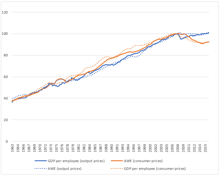 - The following chart shows that ‘decoupling’ of GDP per employee and average earnings is driven by the difference in domestic and consumer prices s.jenkinson@ippr.org.