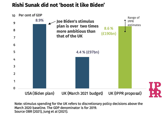 In his budget Rishi Sunak should have “boosted it like Biden” to secure a strong and sustainable recovery, according to IPPR. The chancellor’s total planned stimulus after the budget is only half of the £190 billion IPPR estimates is needed for the economy to bounce back quickly, in a fair and sustainable way.