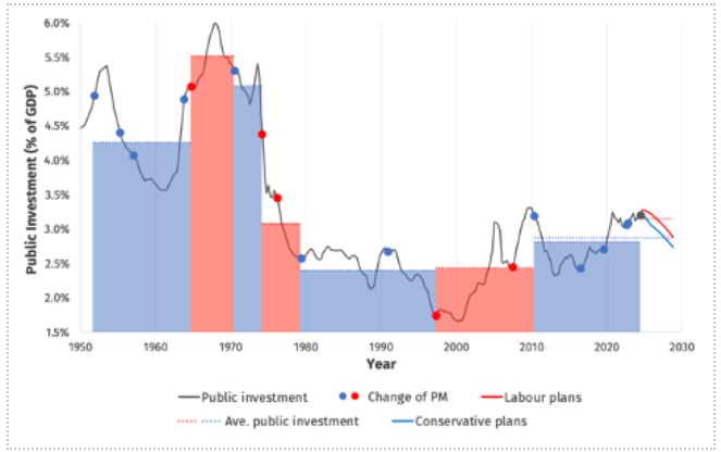 Current Conservative policies imply significant cuts to public investment after the election. Even though Labour promises to invest £4.7 billion more per year than the current government through its ‘Green Prosperity Plan’, this still implies an overall fall in investment.