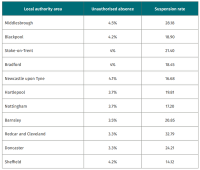- The poorest areas of England have the highest rates of lost learning through unauthorised absences and suspensions. Middlesbrough has a suspension rate of three times the national average (28.18 per cent compared to the national average of 9.33 per cent).