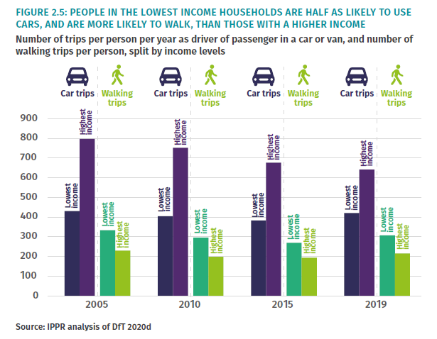 - People in the lowest income households are half as likely to use cars, and more likely to walk, than those with higher income.