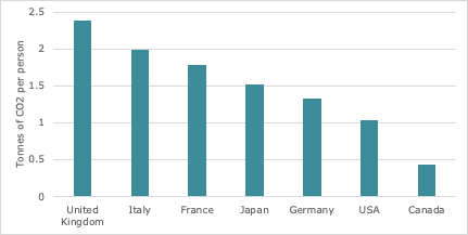 - Fig 1: Net carbon dioxide emissions ‘imported’ per head, G7 countries (average of the years 2009-2018)