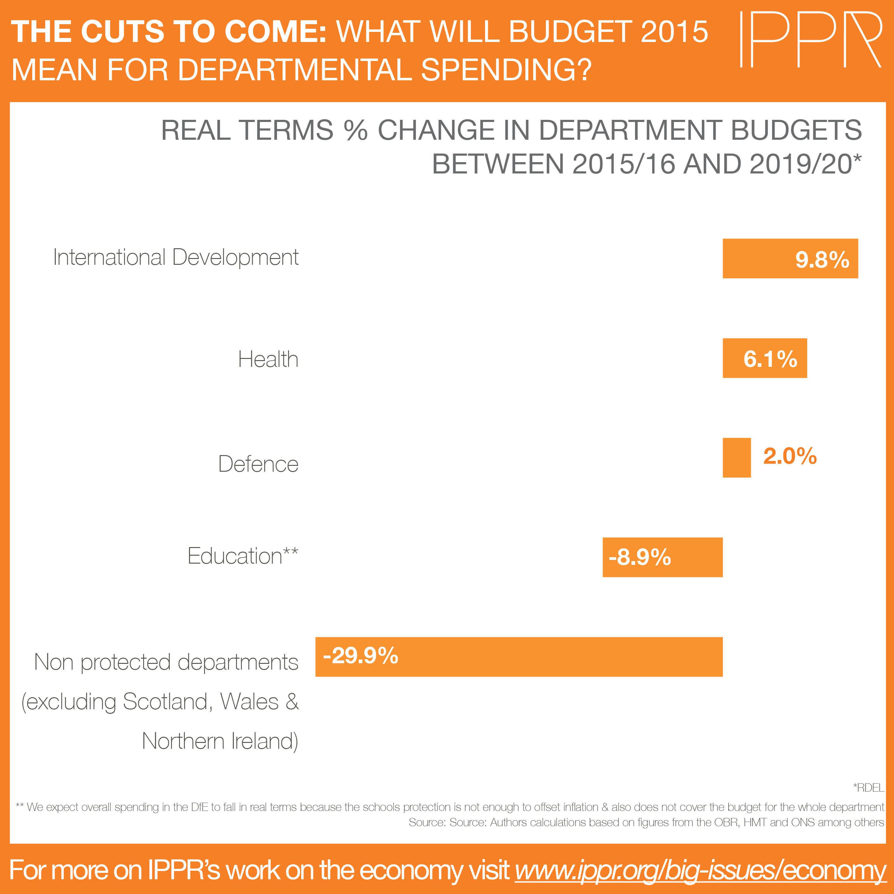 New IPPR analysis has shown that this could imply a real terms cut in resource spending for unprotected departments (excluding Scotland, Wales and Northern Ireland) of around 30 per cent by 2019/20, a cut of approximately 7.5 per cent on average in each of the next four years.