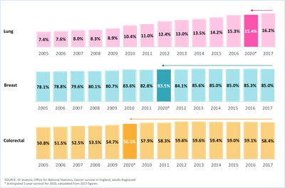 Figure 2. Five-year survival over time and anticipated for 2020, in England